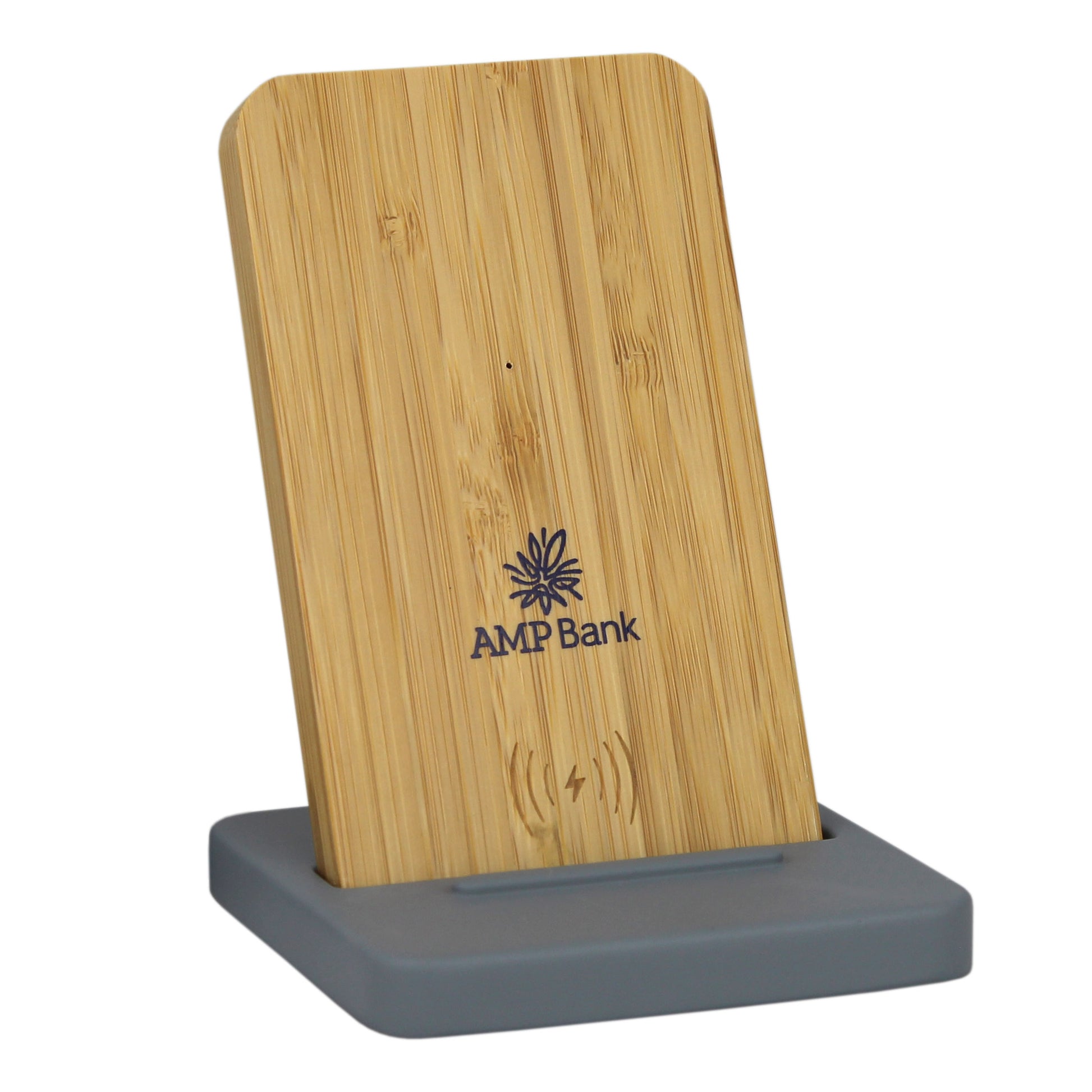 Wireless charger with square base in limestone cement and rectangular stand in natural bamboo.